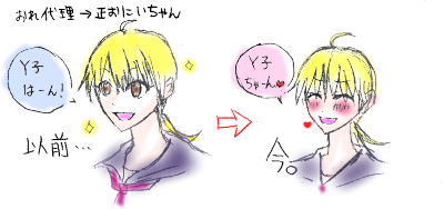 Q61:帆立~頑張れ~今日は学校でちょっとだけ肝試しやって、 其の時K田ちゃんをおいて逃げた!!!!!!! Q62:しぃこ~いっつも聴いてもろてる。 刹那ちゃんとか神代ちゃんも。 んでなんだかんだゆうて大暉にも色々と。 Q63:美術部の皆さん。 Q64:うちのおばあちゃん。(おせっかいともいう。) Q65:K!!!かおれ。 Q66:I。確実に晴れる。 Q67:M北ちゃんとかしィことか。 んでKとかネ★(キモ。+) Q68:帆立~でも内面・・・。 Q69:ん~ あっちゃんの本名とか!!! ま ・ さ ・ し w(お兄ちゃんと一緒:これ書かんとかんちがいされる。) Q70:大暉~ Q71:刹那ちゃん!!!!!!!! Q72:おれ(あだ名が豆の一種。((ちゃぅちゃう Q73:しぃこと大暉と檜とあっちゃん!! Q74:おーれ~おれおれおれ~ みるくで~ つくろぉ~★ Q75:Y子ちゃんとA!! Q76:前のしぃことか。 おれとか。(すぐ直るが) Q77:どんな意味ですか。 なにをきいてるんですか。 じゃあQ43の娘たちでw Q78:おれやな ![]() うそうそ。 檜!!!!ヒマ人の冒険記さいこーーーー!! Q79:しぃこ。つぶれそう。 Q80:二組という子。何年間二組なのか。 8年中6年ですよ!? Q81:H井くん。てか実際。 Q82:え~そんなん!!!!おれ以外の全オンナノコ★(みんなとはいってないで!!) Q83:えええええええええええええええええええ。 おれの親戚の3歳児たっくんwかわいいで~ Q84:檜!檜!!檜!!!!! あっちゃん!あっちゃん!!あっちゃん!!!!! 長いたびだった((ぜえぜえ。・ イニシャルのトコはメールできいてくれたら教えますんでw 気になる人はコメおあメール★ PR 今日は親もいなかったので機嫌よくパソコンちゃんでおえかきしておりました~ 刹那ちゃんの友達にささげる予定の 紅蓮(少年陰陽師)の線画取り込んで 昨日追加したフィルタとか使って やっておりましたさ。 もう背景も入れて 完成間近!!!!!!!!!!!!!!!!!!!!!!! な時に。 保存をしました。 エラーがでました。 「まあ、このソフト復元機能あるしな」と あまりあせることなくとりあえず終了させましたさ。 「よっっしゃ。ひらこか~」 とのんきにアイコンをダブルクリックしたその時!!!!!!! またまたエラー。 開けない。 結局ソフトインストールしなおす羽目に。 昨日ついかしたフィルタも ブラシも そしてけっこううまくいってて(自己満足) 完成間近だった紅蓮さんも消えました。 残っているのは線画だけ。 くっそーパソコンなんて!!!!!! もうやる気をうしなったので。 とりあえず今日はもうやめとこ。 あああああああ ぐれぇぇぇぇぇぇぇぇぇぇぇぇぇぇぇぇぇぇん!!!!!!!!!!!!!!!! かえってきておくれぇぇぇぇぇぇぇぇぇぇぇぇぇぇぇぇぇぇぇぇぇぇぇぇぇぇぇぇぇぇぇぇぇ やっぱり学校はいいですww 皆と会えて、いっぱい笑って、いっぱい話したら 楽になった。 寝られるようになった。 みんなほんまにありがとう。 I の記事は、其の部分だけ削除しました。 やっぱりこういう場に載せることじゃないですよね。 反省。 さてさて。 バレンタイン は友達と生徒会執行部の皆に配りました~本命・・・は ガッコおやすみだったので ポストにin ![]() ![]() してきました~★今日は好きな人といっぱい話せてよかったです ![]() と!!!!!!!!! 元気が出てきた湧いて来た★★ 時雨は今日から絵日記にしようと思います!!! 刹那ちゃんに借りて 一気にはまった漫画、「お兄ちゃんと一緒」 おれは正お兄ちゃんLOVE なんやけども。あまりにも「正お兄ちゃん」「正お兄ちゃん」と言いすぎて 美術部の子達に『正お兄ちゃん禁止令』がでたわけですよ。 口にしてはいけない!!!と。 悲しくなった時雨は正お兄ちゃんの近くにいたかった(?)のか こんな現象がおこりました。 おれの代理は正お兄ちゃんで★ なんでって。 後ろ1つくくりってのが一緒なだけで** コトバうつっちゃったよ!!!!!!!!!! で、悩みましたさ。 で、気づく。 どーするおれ!?!?!?!? しかも「元に戻す」って選択肢なし・・・。 あ、おれ女だよ?? 一応。 タイトルに意味はない。 気にしないでくれ。 何処の誰って感じですね。 なんか以上にテンション低いです。 3/7にw-inds.のNEWアルバム発売やし、 3/28にはリミックスシングル(?)も発売やのに!!!!!!!!!!!!! しかも今日は「お兄ちゃんと一緒」(4)(5)もゲッチュして めっちゃHAPPYなはずやのに!!!!!!!!!!!!!!!!!!!!!!!!!!!!!!!!!!!!!!!!!!!!!!!!!!!! 原因は自分でもわかってるんです。 でも自分でどうにかできるレベルの問題じゃなくて、 どうにかしようと努力はしてるつもりだけど、 どうにもならないっつーか。 ごめんなさい。意味わかりませんよね。。。 時雨は時々腹黒になったり 意味不になったり わけわからんですよ。 ちょっと、自分がつらいというより 自分の大好きな子がものすごくつらい状況におかれてて、 それがおれも辛いんです。 (←クリックでおっきくなります。) 大好きなオロナ〇ンCに〆切が2006年7月の応募シールが いまだについているのはなぜだろう・・・。 ちょっと気になる。そんだけの話。 つか、初画像UPがコレって言うのもどうなんだろう・・・。 ハイ。 今日は体育でバトミントンやりました~ 頑張って拾おうとして自分の足につまづいて 